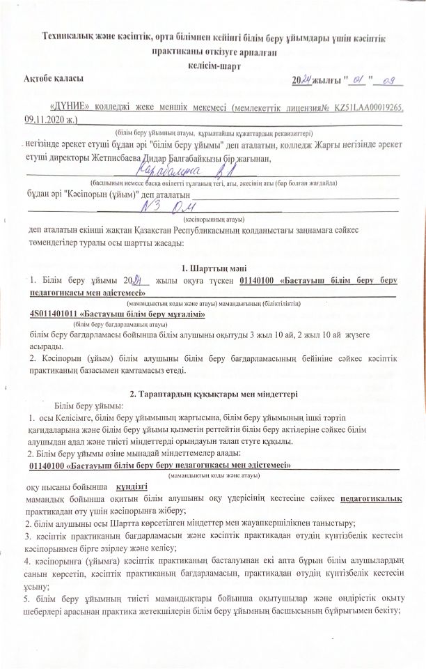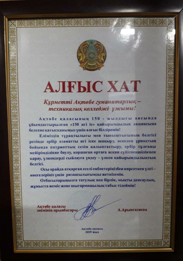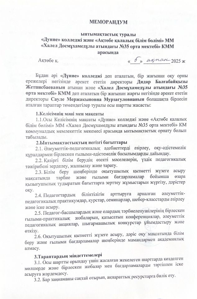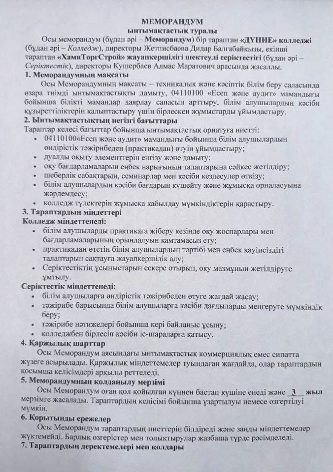 колледж ДҮНИЕ основан в 1996 году. Преподавательский состав Актюбинского гуманитарно-технического колледжа из года в год повышает свой профессиональный уровень, у нас работают педагоги первой и высшей категории, магистры, отличники образования РК. Мы с уверенностью смотрим в будущее. Созданы условия для дальнейшей эффективной деятельности вобласти подготовки кадров средне-профессионального звена, востребованных на рынке труда. Наши выпускники работают во всех сферах экономики в разных уголков нашего Казахстана. Дружный коллектив, доброжелательная атмосфера и понимание создают благоприятные условия для работы, учебы, творчества,отдыха. Будущее за нами!